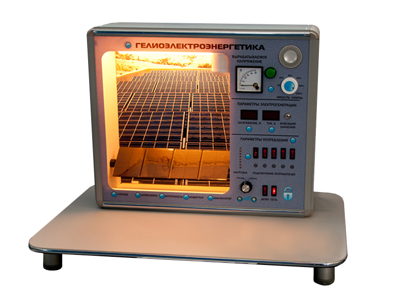 Комплект учебно-лабораторного оборудования представляет собой реалистичную функционирующую модель системы выработки электроэнергии путем преобразования световой энергии в электрическую и наглядно демонстрирует принципы работы гелиоэлектростанции. Обучающийся может самостоятельно менять яркость источника света, соединять фотопанели последовательным, параллельным способом, менять угол падения лучей света на фотопанели, прослушивать голосовое сопровождение "Виртуального учителя", проводить измерения вырабатываемого напряжения и исследовать процессы потребления электроэнергии. Установка снабжена системой, моделирующей потребление электроэнергии, а также электронным блоком регистрации и индикации электрических процессов. Передняя панель наполовину сделана из прозрачного полимерного материала. Вторая половина передней панели непрозрачна и содержит органы управления электрическими цепями и индикацию.