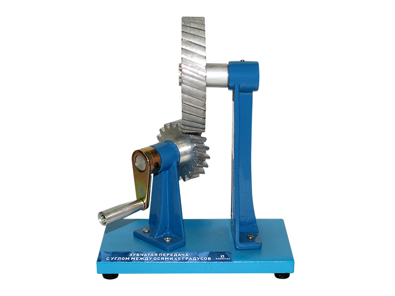 Модель механизма на подставке "Зубчатая передача с углом между осями 45 градусов"