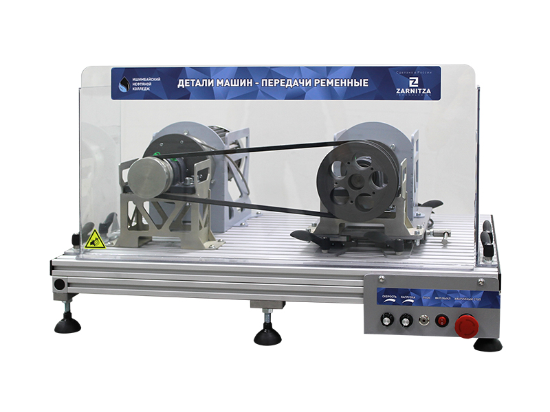 Комплект учебно-лабораторного оборудования представляет собой модульную конструкцию с возможностью использования модуля привода и модуля нагружения для изучения характеристик различных механических передач. В качестве модуля привода используется электродвигатель с возможностью регулировки частоты вращения вала электродвигателя, а в качестве модуля нагружения используется электромагнитный порошковый тормоз с возможностью регулировки нагружающего момента. Проведение лабораторных занятий и обработка результатов эксперимента производится с помощью ноутбука с применением специализированного программного обеспечения. Программное обеспечение позволяет производить исследование закономерности изменения коэффициента полезного действия (КПД), скольжения, оборотов ременной передачи при различных режимах работы, а также формировать отчет по результатам экспериментов.