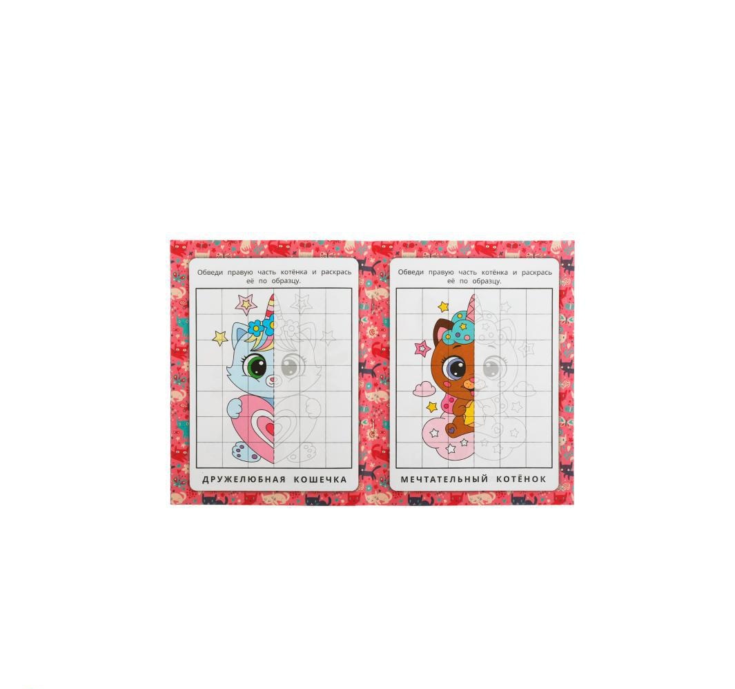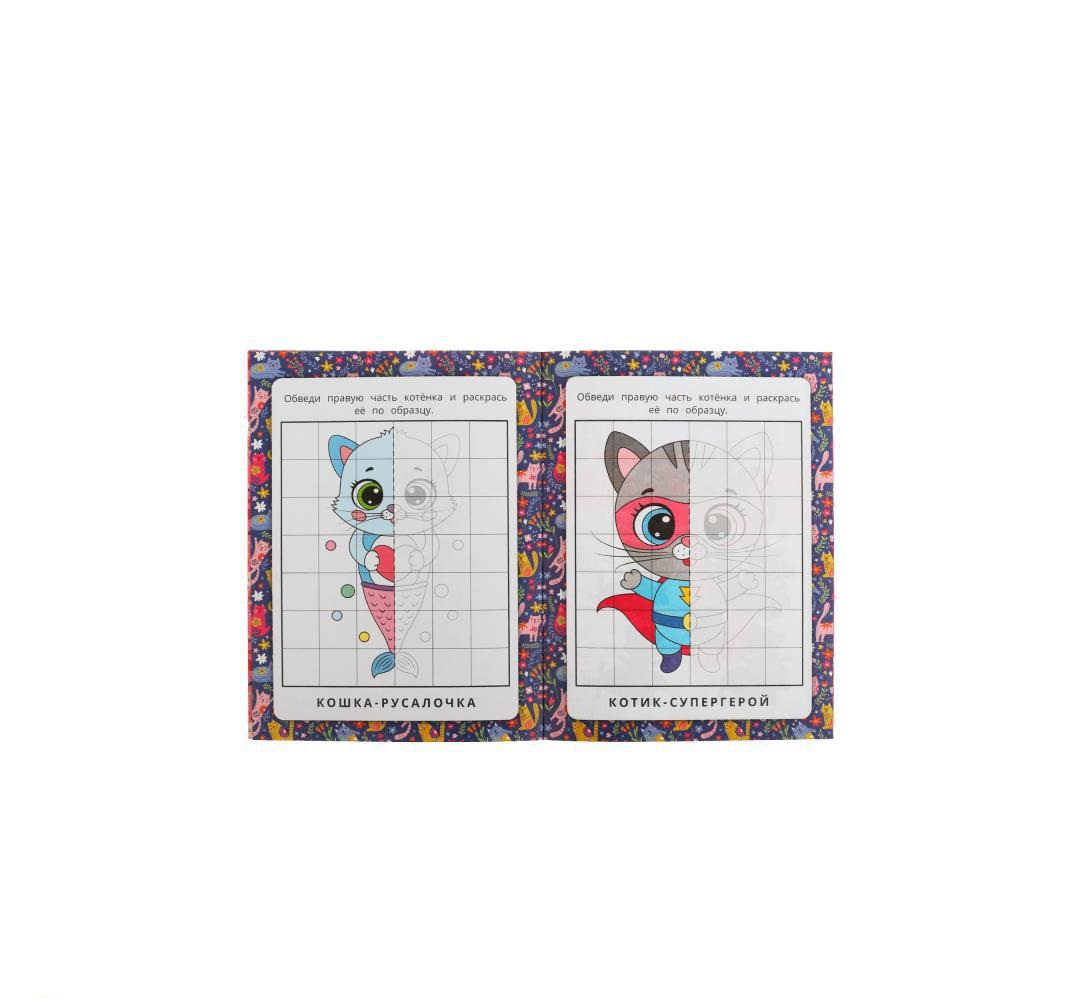 В данной раскраске с иллюстрациями очаровательных котят маленькому художнику предлагается дорисовать правую часть картинки в зеркальном отображении, а затем раскрасить её согласно цветовой гамме левой стороны рисунка. Благодаря простым и понятным картинкам ребёнок сможет потренироваться в рисовании и развить моторику рук.
