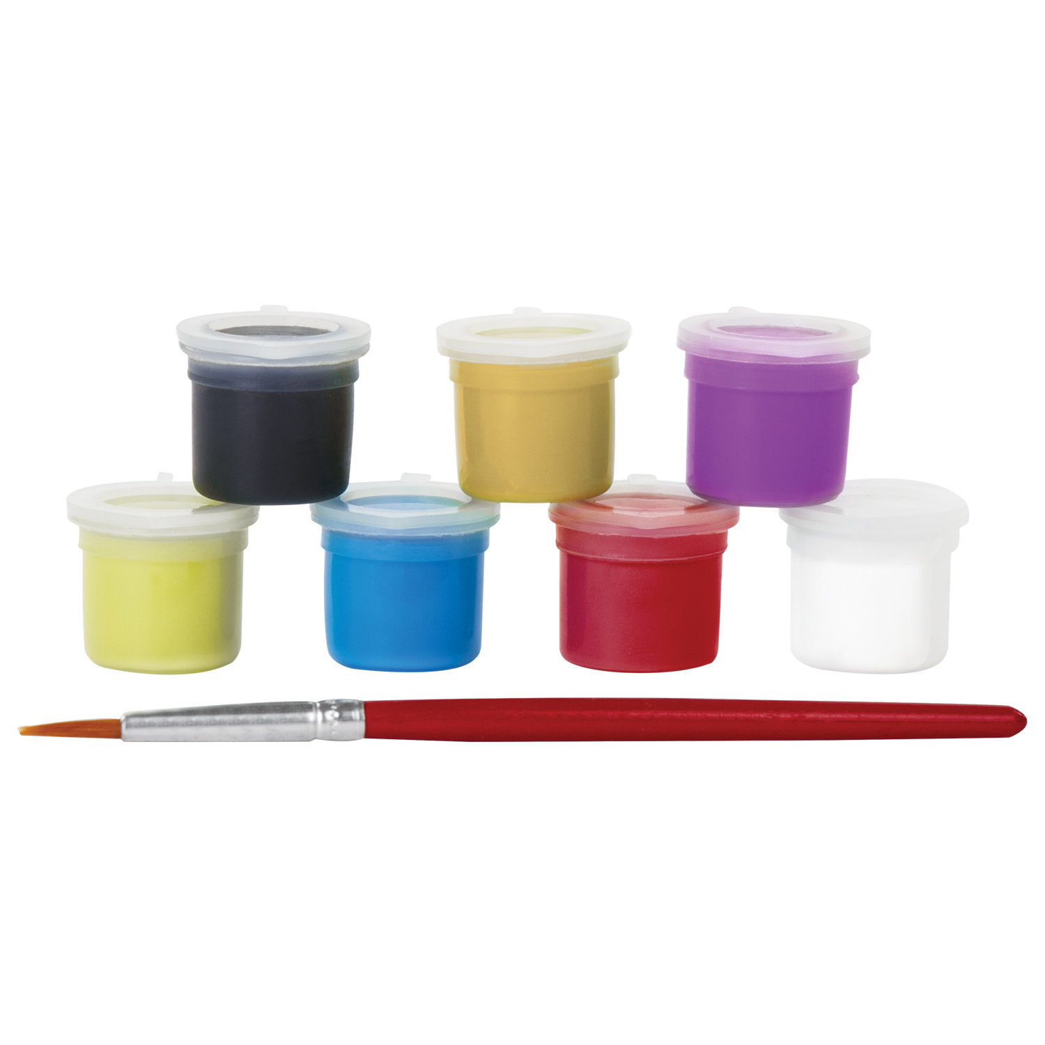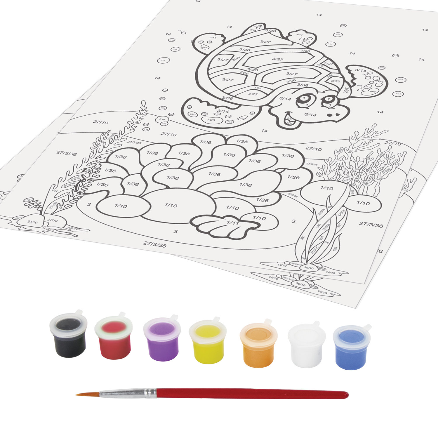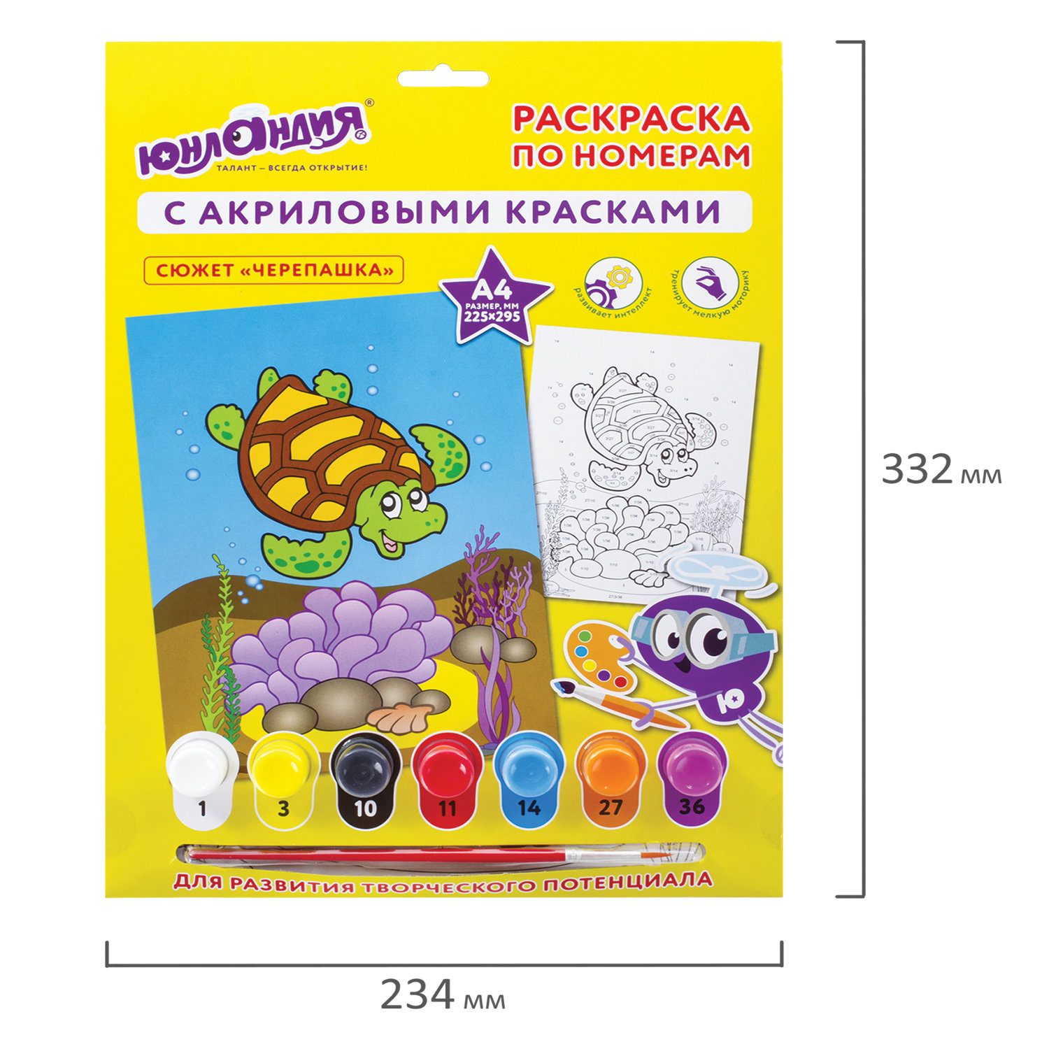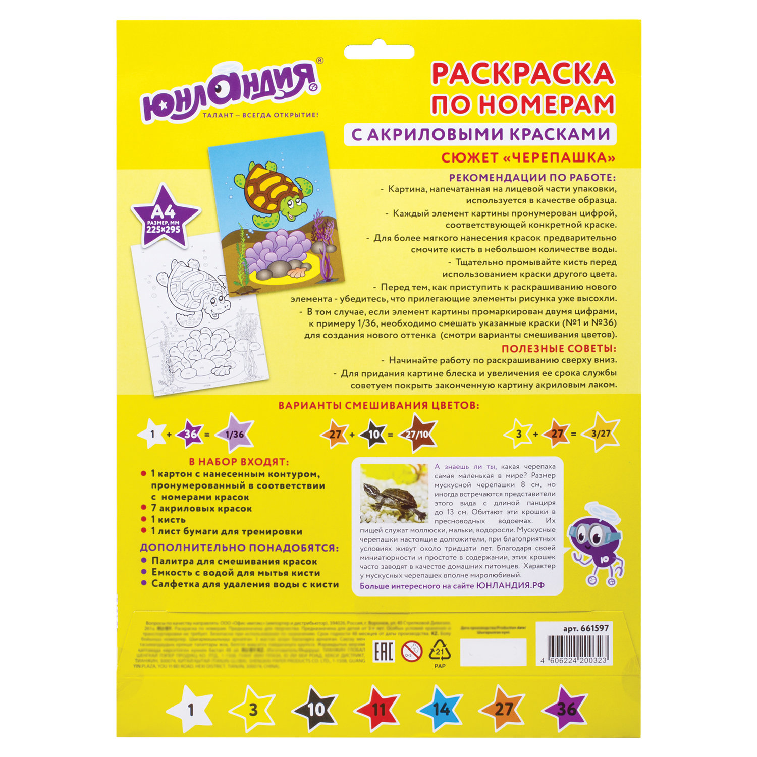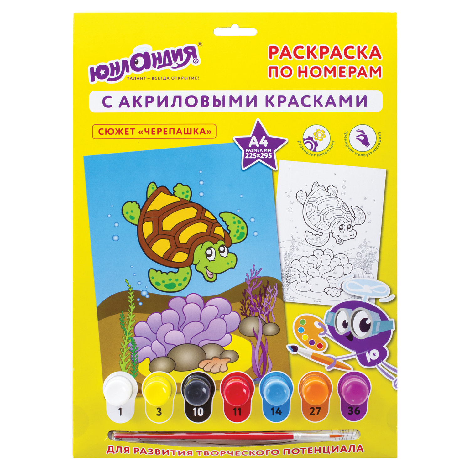 В набор входят: 7 акриловых красок по 3 мл каждая, лист для тренировки, картонная основа с нанесенным контуром формата А4 (210х297 мм), синтетическая кисть.