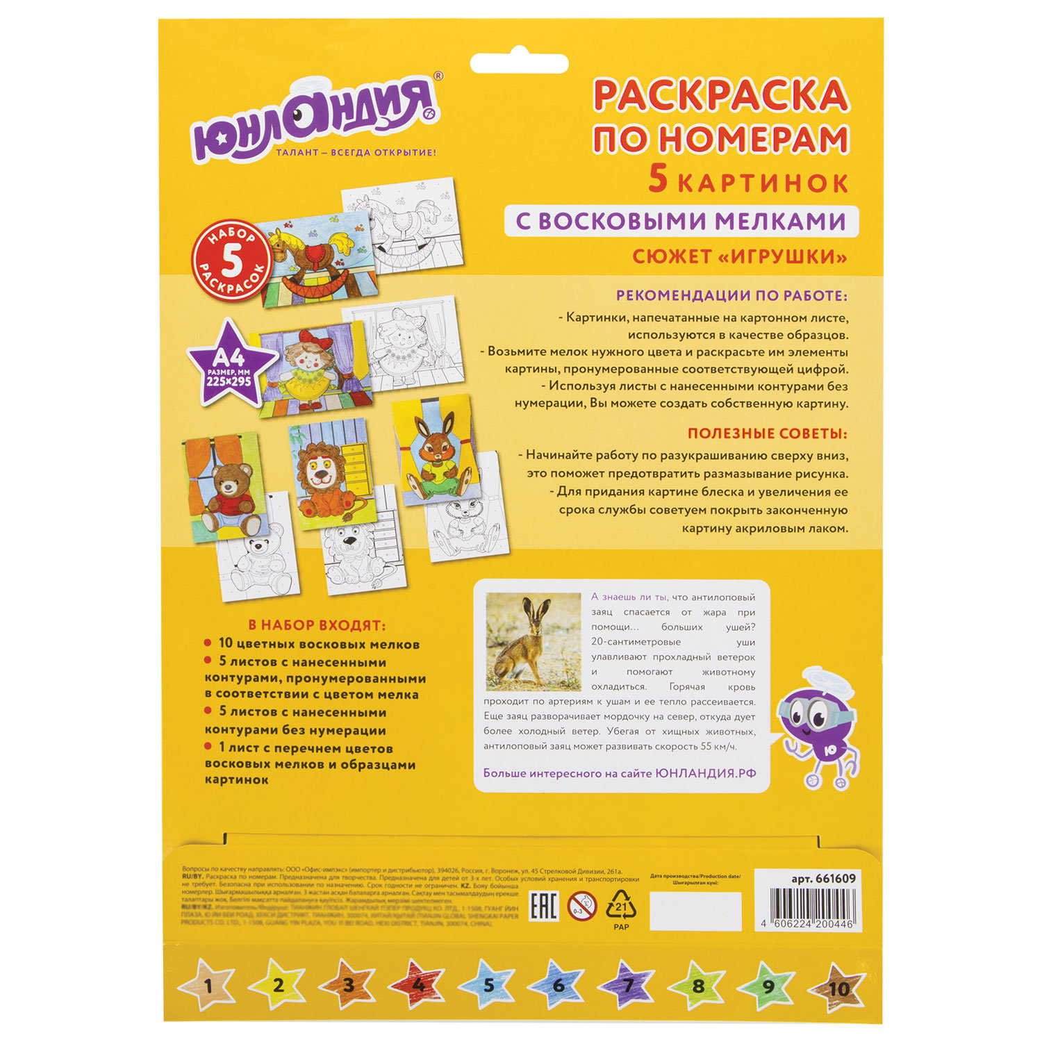 —Раскраска по номерам А4, ЮНЛАНДИЯ "ИГРУШКИ", С ВОСКОВЫМИ МЕЛКАМИ, 5 картинок, 661609