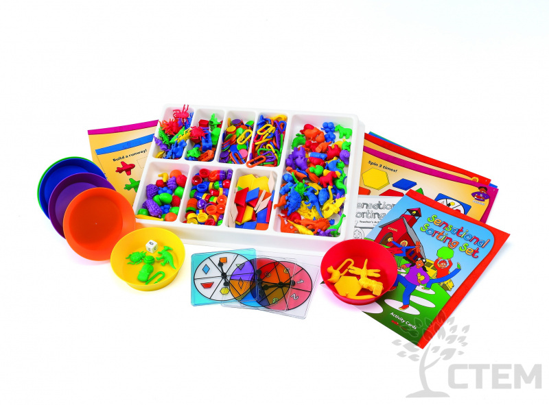 Набор состоит из 700 деталей. В набор входят: большой сортировочный поднос с 8-ю отделениями, три рулетки (с возможностью выбора цвета, формы и количества), игральный кубик с числами, шесть сортировочных чашек 6-ти разных цветов, разноцветные фишки двух видов, соединяющиеся звенья, мозаика "Геометрические фигуры", счетный материал: "Транспорт", "Фрукты", "Динозавры", "Насекомые", "Домашние животные".