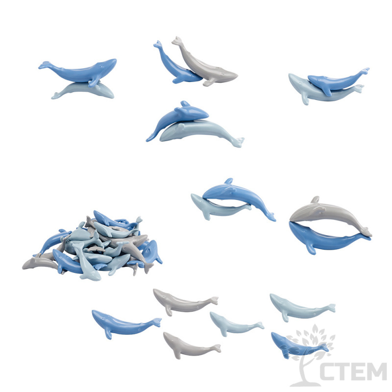 В состав набора входят: 18 больших китов, 18 маленьких китов в 3 цветах и красочный буклет.