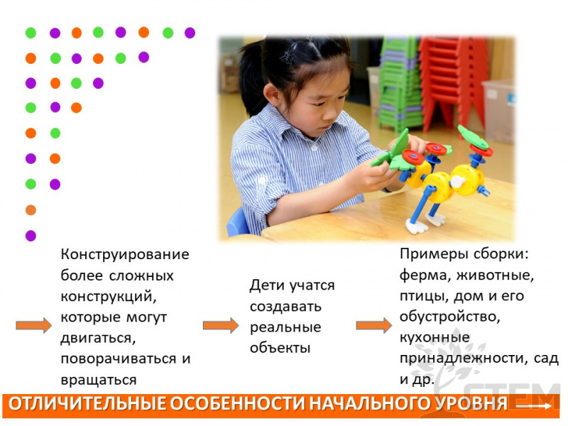 Игровой набор состоит из 1300 деталей. На среднем этапе дети учатся создавать реальные объекты (по инструкции и схеме), затем менять или дополнять их для изменения внешнего вида или функциональности. Дети научатся строить более сложные конструкции, в том числе динамические модели, которые могут двигаться, поворачиваться и вращаться (ферма, животные, птицы, дом и его обустройство, кухонные принадлежности, сад и др.) Лотки синего цвета в комплект не входят. Набор упакован в лоток-конструктор с крышкой в количестве 4 штук.