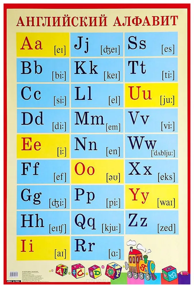 На красочно оформленном плакате помещен английский алфавит с транскрипцией. Гласные буквы отмечены красным цветом.