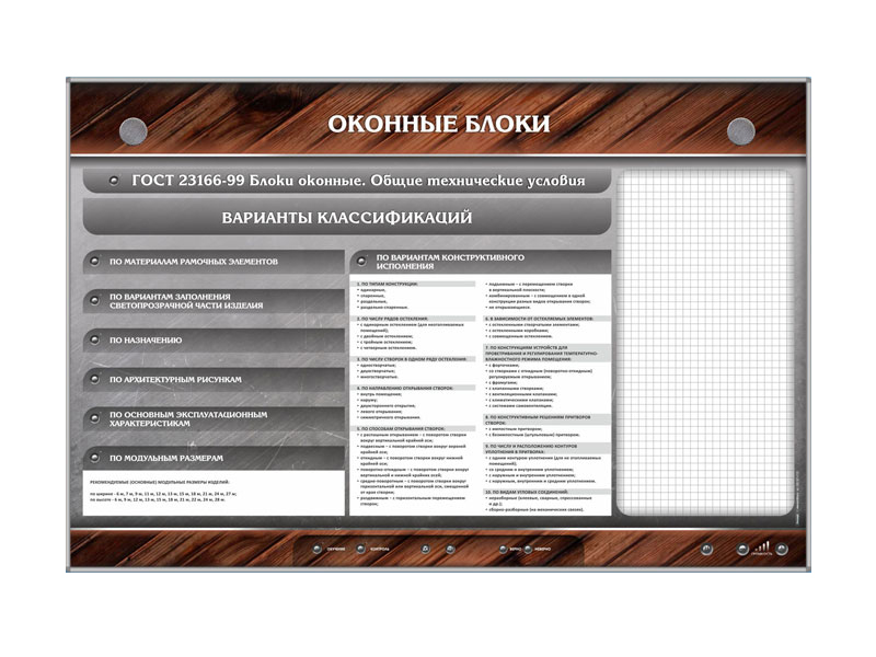 Предусмотрено два режима работы со стендами: "Обучение" и "Контроль". В режиме "Обучение" на панели управления, расположенной в нижней части стенда, при помощи элемента управления выбирается один из подразделов, световая индикация подсвечивает данную позицию, а программное обеспечение "Виртуальный учитель" рассказывает о различных видах оконных блоков; о видах плотничных соединений; о правилах установки и видах дверных блоков. В режиме "Контроль" программный код управления генерирует случайный вариант вопроса. При правильном или неправильном выборе ответа загорается соответствующая принятым стандартам светодиодная индикация.