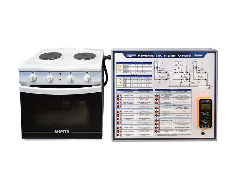 Оборудование настольного блочного исполнения включает действующий образец бытовой электроплиты, оснащенной модулем ввода неисправностей и мультиметром. На лицевой панели модуля ввода неисправностей отображена принципиальная схема электроплиты с контрольными гнездами, позволяющими с помощью мультиметра осуществить локализацию введенных неисправностей.