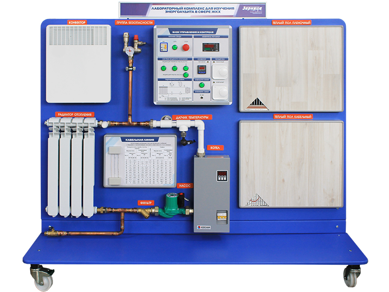 Модуль "Системы отопления". Модуль представляет подвижную металлическую раму напольного исполнения, окрашенную порошковой краской, на которой закреплен набор потребителей электрической энергии, обладающих различными характеристиками: теплый пол (два типа), конвектор, электрический котел, циркуляционный насос.