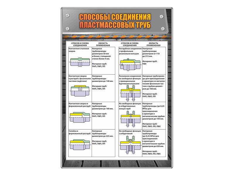 Стенд представляет собой информационную панель, на которой размещены сведения о способах соединения пластмассовых труб.