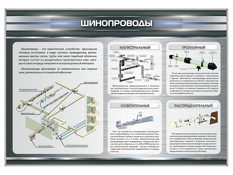 Стенд представляет собой информационную панель, на которой размещена иллюстрированная информация о разновидностях шинопроводов для передачи электроэнергии на расстояния к потребителям.