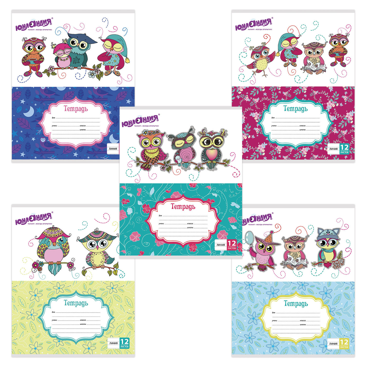 Тетрадь 12л. ЮНЛАНДИЯ линия, обложка картон, "УМНЫЕ СОВЫ", 104912