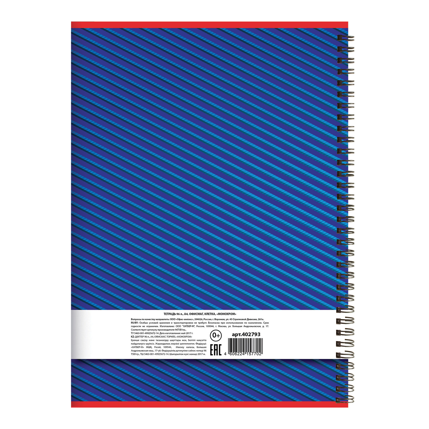 Количество листов: 96 Тип скрепления: евроспираль Обложка: мелованный картон Формат: А4 Линовка блока: клетка Внутренний блок: офсет Плотность внутреннего блока: 60 г/м2 Белизна: 100 % Перфорация: микроперфорация на отрыв, перфорация для подшивки в архив Однотонный дизайн обложки: да Количество дизайнов в упаковке: 1