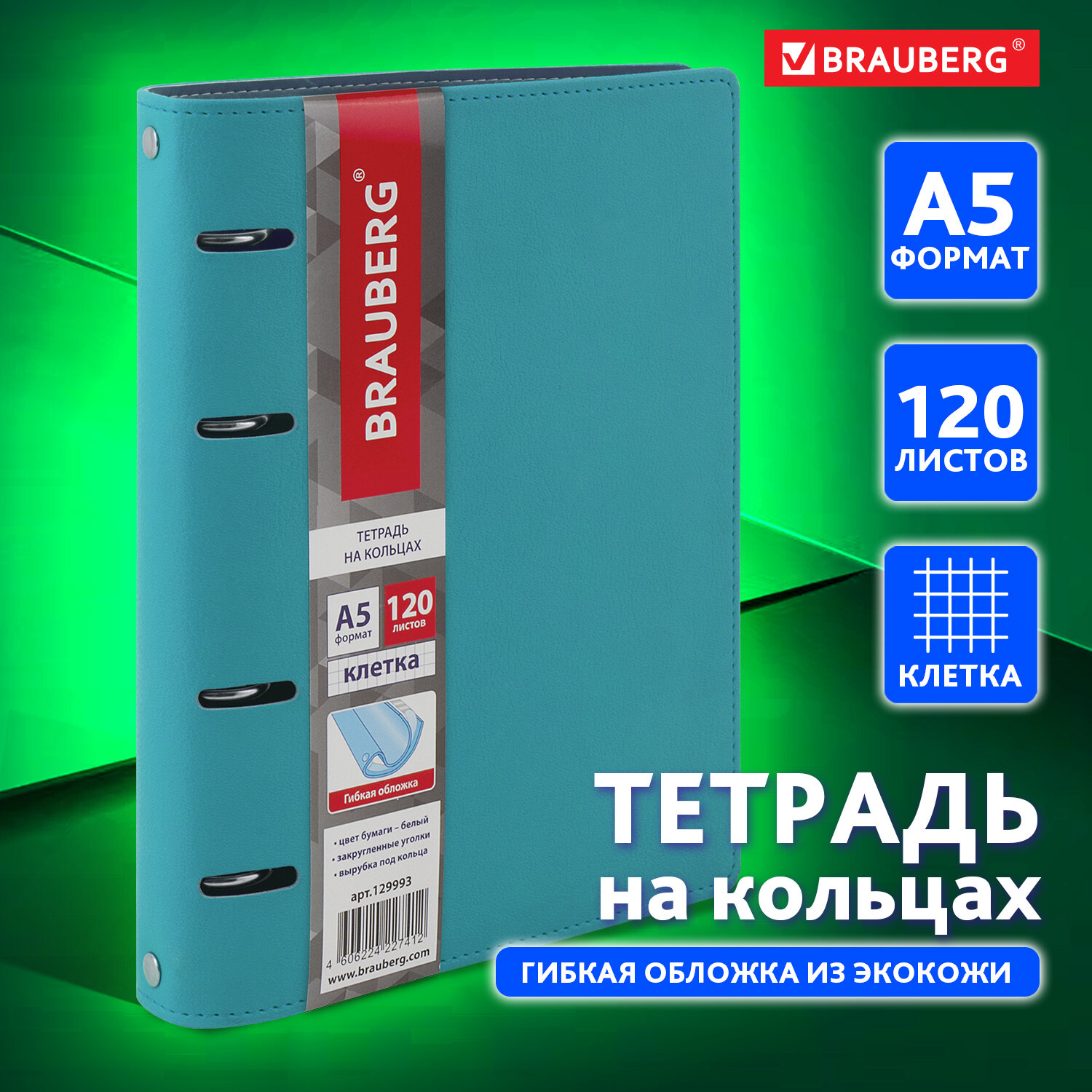 —Тетрадь на кольцах А5 (180х220мм) 120л. BRAUBERG "Joy", под кожу, клетка, , бирюзовый/серо-голубой