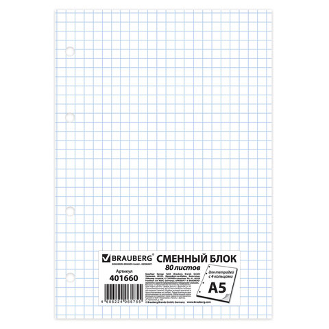 Формат: А5 Общее количество листов: 80 Вид бумаги: офсет Плотность бумаги: 60 г/м2 Белизна: 92-98 % Вид линовки: клетка Цвет сменного блока: белый Термоупаковка: да