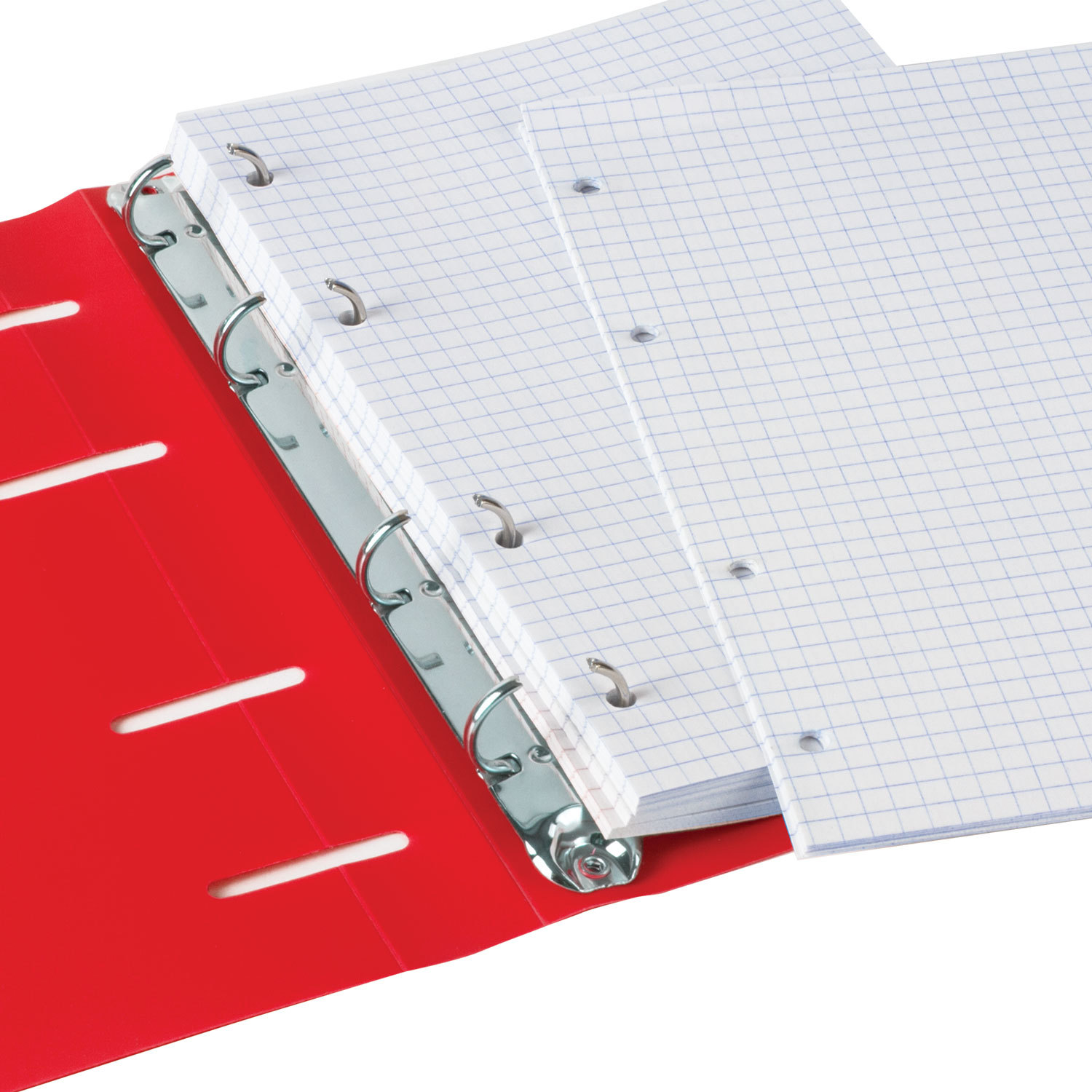 Блок состоит из 80 листов офсетной бумаги белого цвета плотностью 60 г/м2. Линовка - клетка. Обложка с вырубкой под кольца выполнена из износоустойчивого пластика. Формат А5 является стандартным и обеспечивает комфортное ношение в рюкзаке/ранце или папке. Оборудована кольцевым механизмом с 4-мя кольцами для подшивки сменных блоков, что позволит носить на учебу/работу всего одну тетрадь с возможностью добавлять и менять листы.