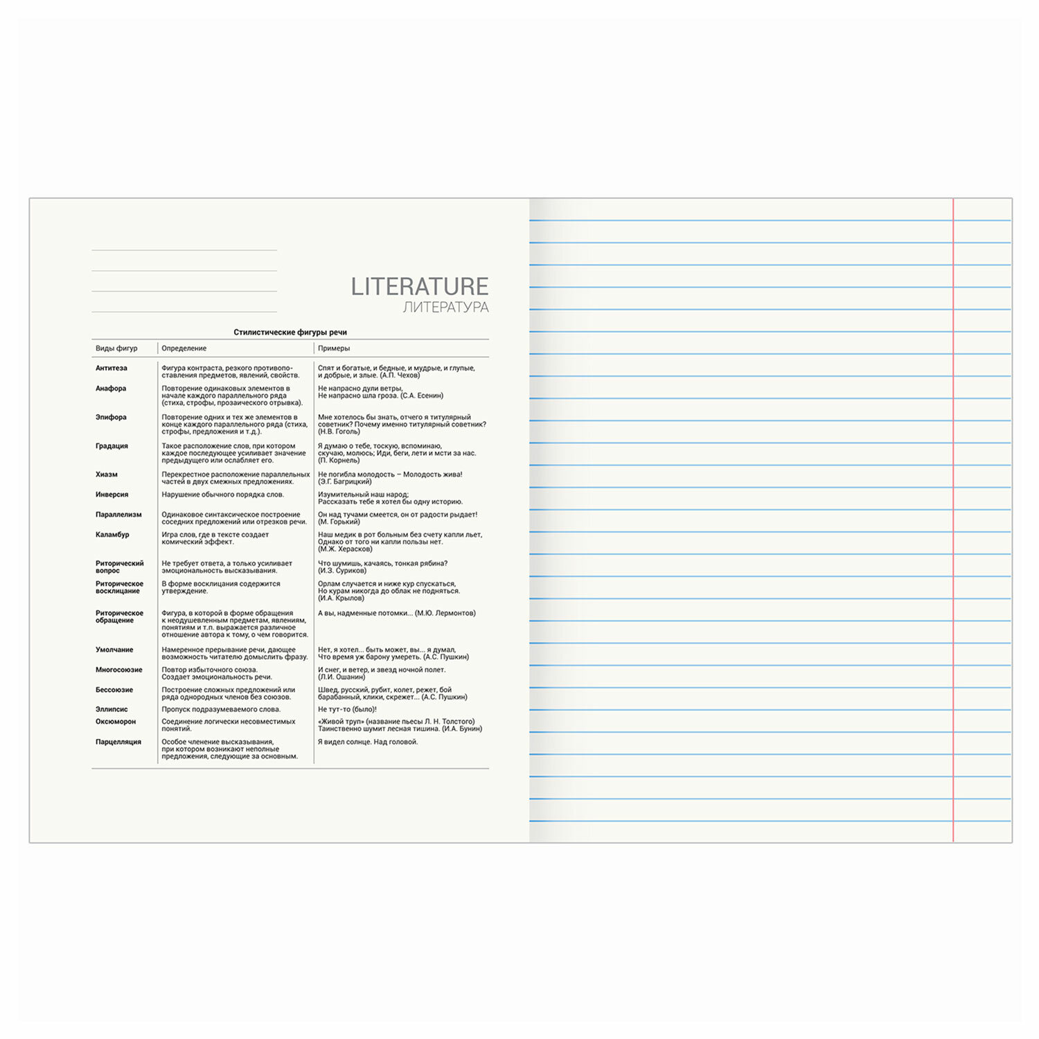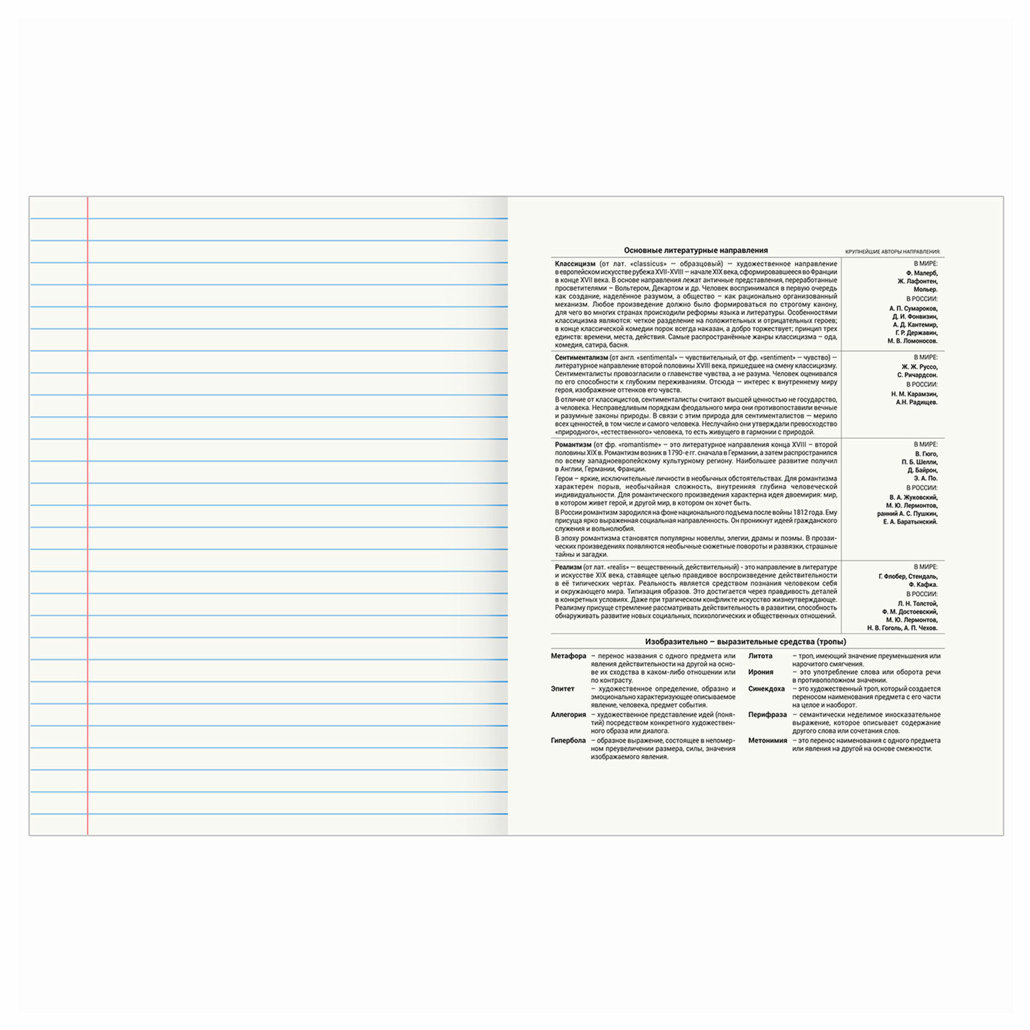 Тетрадь по литературе формата А5 (165х202 мм) содержит 48 листов, изготовленных из высококачественной офсетной бумаги плотностью 60 г/м2 и белизной 100%.